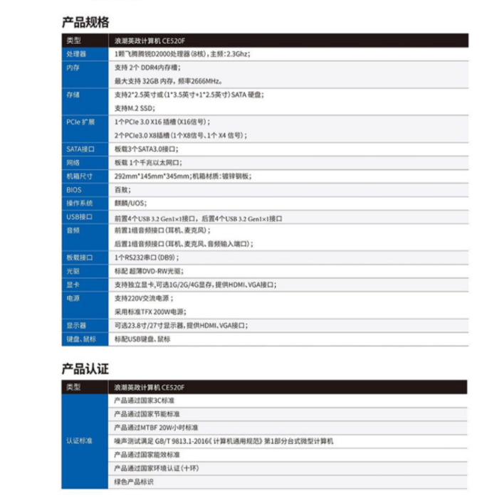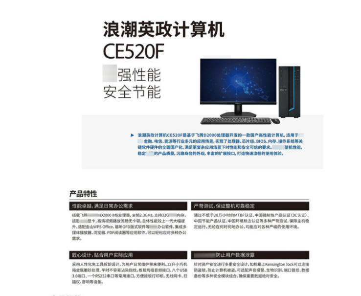 INSPUR浪潮 CE520F 1顆飛騰D2000處理器 硬盤獨立顯卡 8GB內(nèi)存256GB SATA SSD硬盤鍵鼠